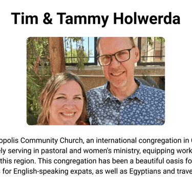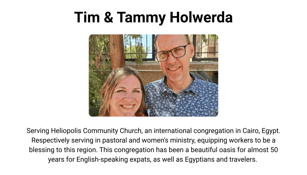 Serving Heliopolis Community Church, an international congregation in Cairo, Egypt. Respectively serving in pastoral and women's ministry, equipping workers to be a blessing to this region. This congregation has been a beautiful oasis for almost 50 years for English-speaking expats, as well as Egyptians and travelers.