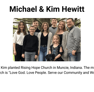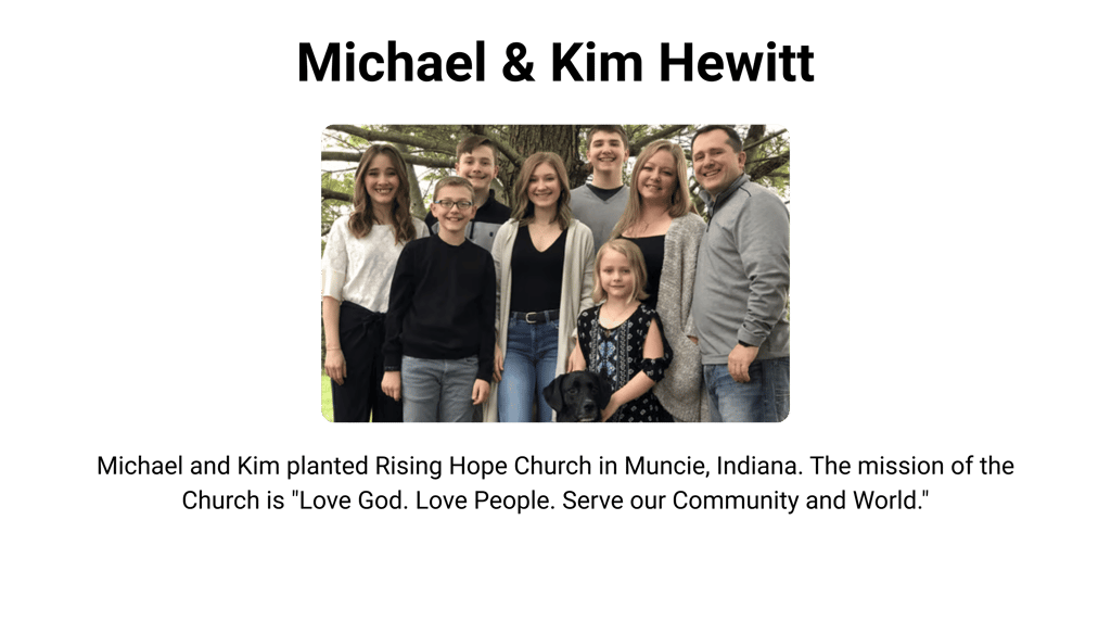Michael and Kim planted Rising Hope Church in Muncie, Indiana. The mission of the Church is "Love God. Love People. Serve our Community and World."
