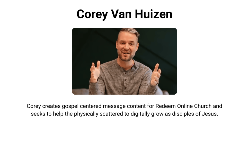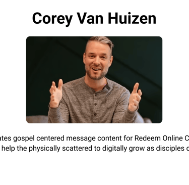 Corey creates gospel centered message content for Redeem Online Church and seeks to help the physically scattered to digitally grow as disciples of Jesus.