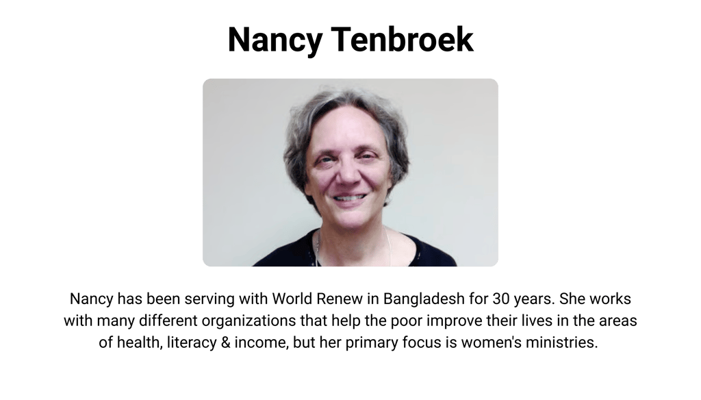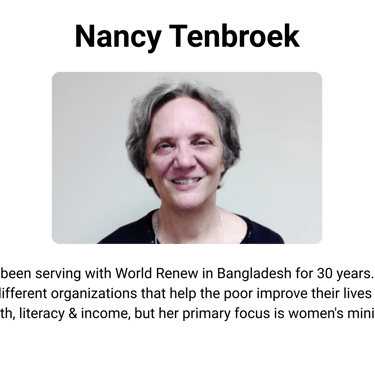 Nancy has been serving with World Renew in Bangladesh for 30 years. She works with many different organizations that help the poor improve their lives in the areas of health, literacy & income, but her primary focus is women's ministries.