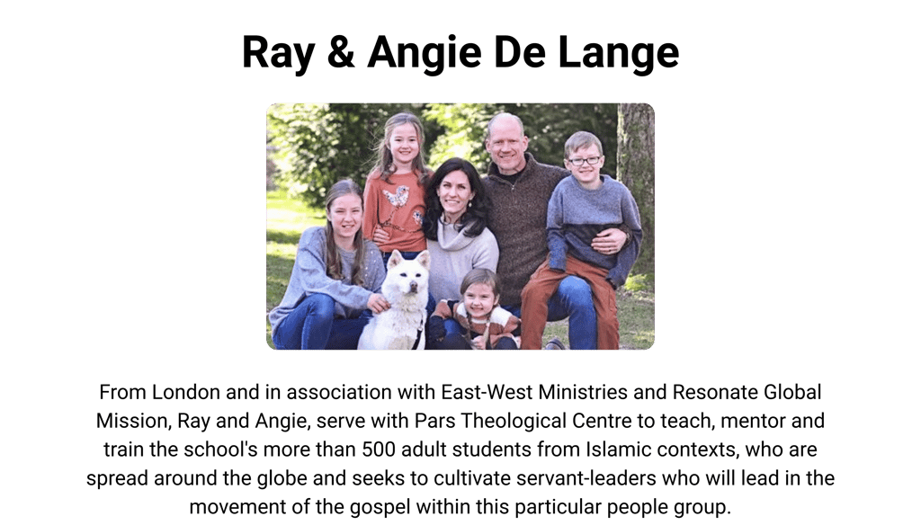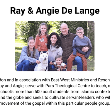 From London and in association with East-West Ministries and Resonate Global Mission, Ray and Angie, serve with Pars Theological Centre to teach, mentor and train the school's more than 500 adult students from Islamic contexts, who are spread around the globe and seeks to cultivate servant-leaders who will lead in the movement of the gospel within this particular people group.