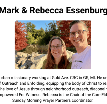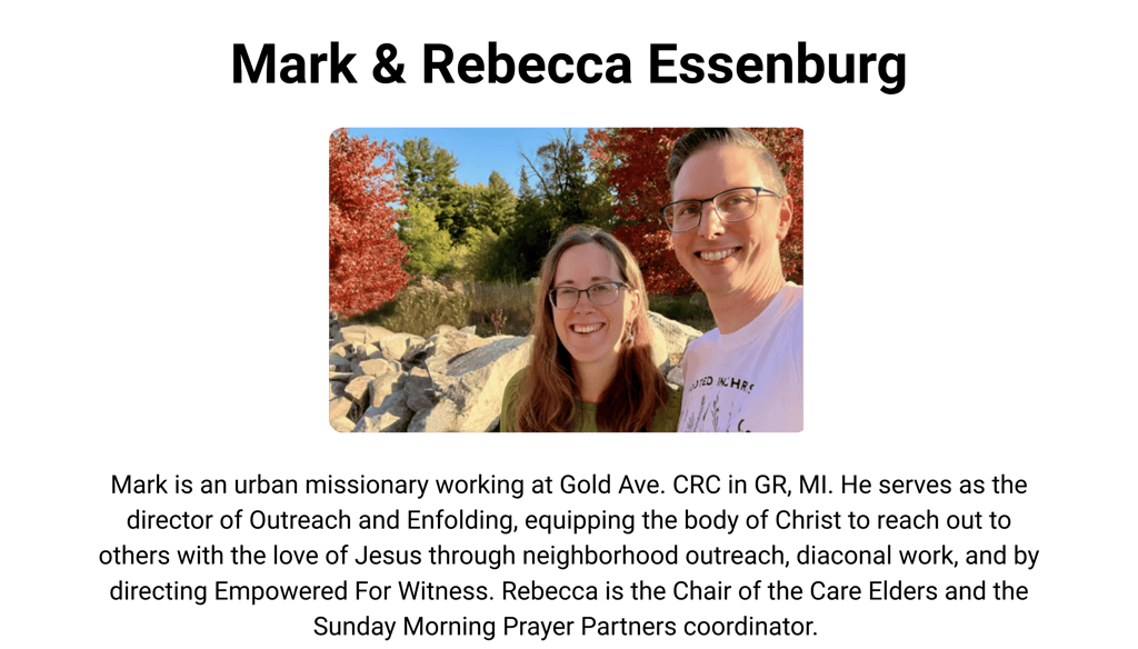 Mark is an urban missionary working at Gold Ave. CRC in GR, MI. He serves as the director of Outreach and Enfolding, equipping the body of Christ to reach out to others with the love of Jesus through neighborhood outreach, diaconal work, and by directing Empowered For Witness. Rebecca is the Chair of the Care Elders and the Sunday Morning Prayer Partners coordinator.