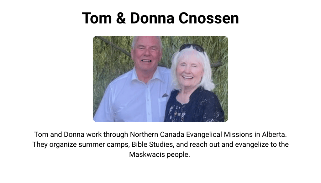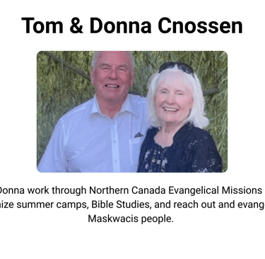 Tom and Donna work through Northern Canada Evangelical Missions in Alberta. They organize summer camps, Bible Studies, and reach out and evangelize to the Maskwacis people.