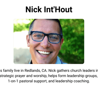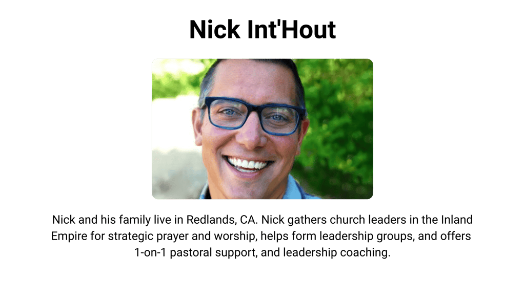 Nick and his family live in Redlands, CA. Nick gathers church leaders in the Inland Empire for strategic prayer and worship, helps form leadership groups, and offers 1-on-1 pastoral support, and leadership coaching.