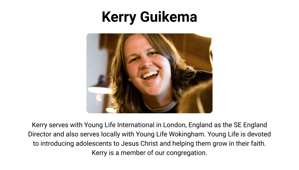 Kerry serves with Young Life International in London, England as the SE England Director and also serves locally with Young Life Wokingham. Young Life is devoted to introducing adolescents to Jesus Christ and helping them grow in their faith. Kerry is a member of our congregation.