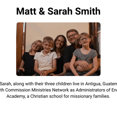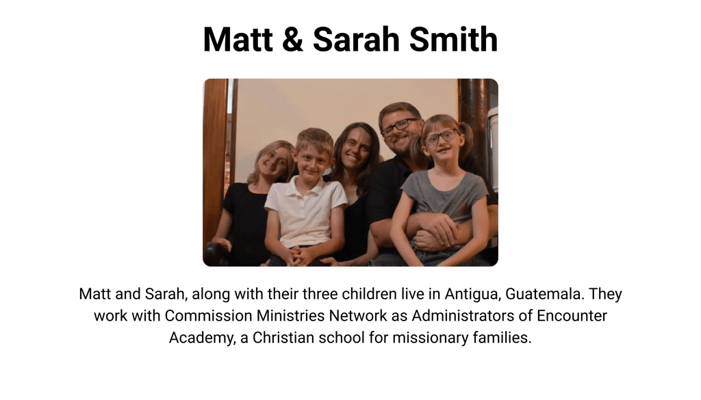 Matt and Sarah, along with their three children live in Antigua, Guatemala. They work with Commission Ministries Network as Administrators of Encounter Academy, a Christian school for missionary families.
