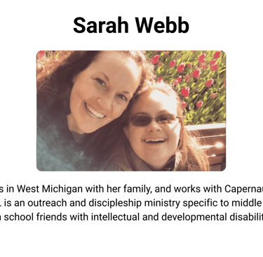 Sarah lives in West Michigan with her family, and works with Capernaum Young Life. CAPYL is an outreach and discipleship ministry specific to middle school and high school friends with intellectual and developmental disabilities.